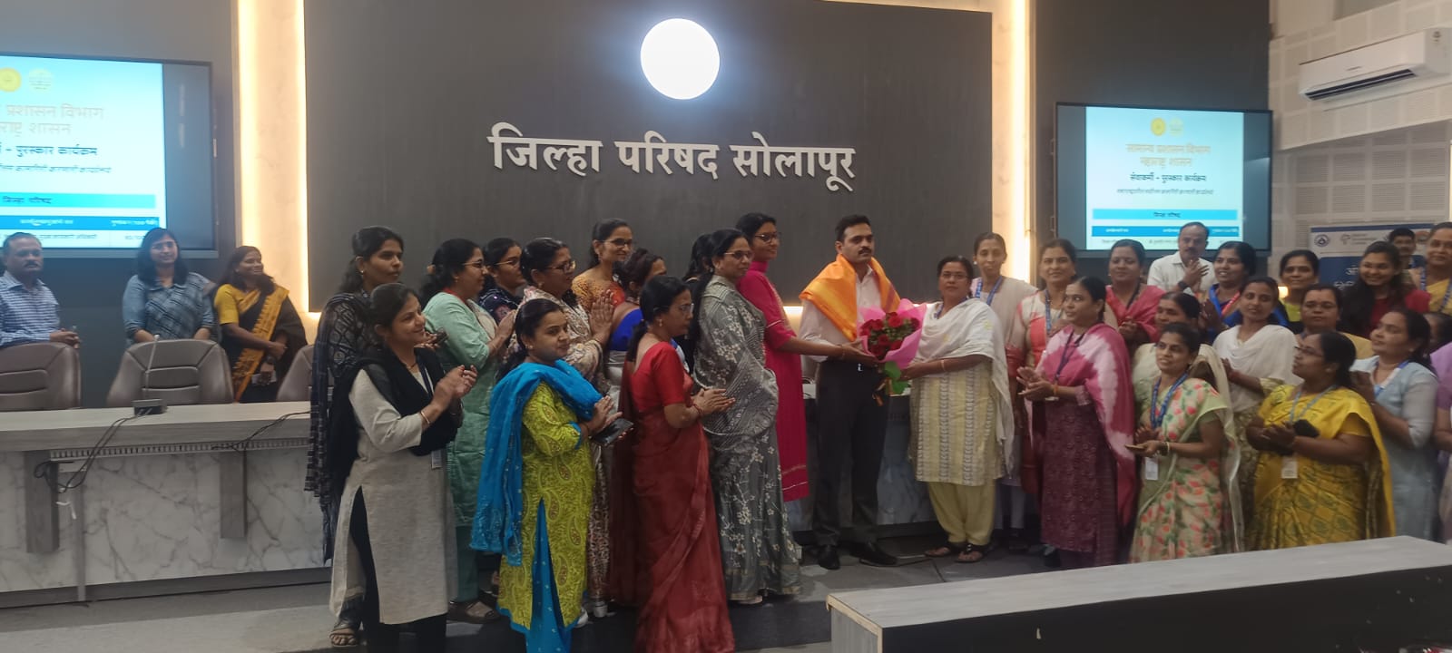 सोलापूर : सेवाकर्मी कार्यक्रमाच्या गुणांकनामध्ये सोलापूर जिल्हा परिषदेने महाराष्ट्रात प्रथम क्रमांक पटकावून घवघवीत यश संपादन केले आहे. सर्व संवर्गांची अद्ययावत व ज्येष्ठता सूची, पदोन्नतीने नियुक्तीची स्थिती, सरळ सेवा नियुक्ती, रिक्त पदांची अद्ययावत माहिती, बिंदू नामावली प्रमाणीकरण, अनुकंपा नियुक्ती प्रक्रिया, आय-गोट पोर्टलवर १००% नोंदणी ,तसेच सर्व कर्मचाऱ्यांच्या सेवा पुस्तिकांचे अद्ययावत करणे आदी सर्व निकषांवर सोलापूर जिल्हा परिषदेने आपली प्रशासकीय गुणवत्ता सिद्ध केली आहे. या उल्लेखनीय यशाबद्दल सोलापूर जिल्हा परिषदेचे मुख्य कार्यकारी अधिकारी मा.कुलदीप जंगम यांचा सर्व महिला कर्मचारी वर्गाच्या वतीने भव्य सत्कार करण्यात आला.