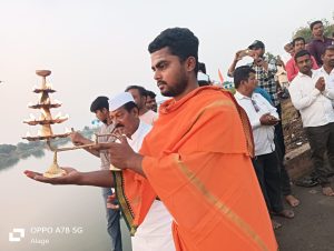 सोलापूर ; भीमा व सीना नदीच्या संगमात काटोकाठ भरलेले निळेश्वर पाणी, घाटावर साकारण्यात आलेली सुंदर रंगावली, हजारो दिव्यांनी उजळलेले प्रकाश, सूर्य मावळतीला जातानाचा सोनेरी रंगाचा पडलेली छाया, मुखी नमामि गंगे हर हर गंगे चा गजर, संगमेश्वर महाराजांचा जयजयकार अशा भक्तिमय वातावरणामध्ये रविवारी सायंकाळी सव्वा सहा वाजण्याच्या सुमारास हत्तरसंग कुडल (दक्षिण सोलापूर) येथे संगम आरती करण्यात आली. महाशिवरात्रीनिमित्त हत्तरसंग कुडल (दक्षिण सोलापूर) येथे नद्यांची कृतज्ञता व्यक्त करण्यासाठी रवीवारी दि.15 फेब्रुवारी रोजी सायंकाळी संगम आरती आयोजित करण्यात आली होती. मल्लिकार्जुन बिराजदार यांच्याहस्ते संकल्प पूजा करून संगम आरती करण्यात आली. प्रारंभी दीपप्रज्वलन प्रा. निलेश भिडे, सिद्धेश्वर बिराजदार, राजू लेंगरे यांच्याहस्ते तर विठ्ठल विजापूरे यांच्या हस्ते ओटी भरून नदीला नैवेद्य अर्पण करण्यात आले.